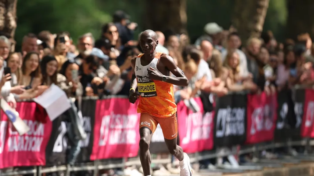 Kipchoge non vince aggredendo. Vince gestendo. Passo uniforme, postura composta, economia di movimento quasi meccanica. In gara non si vede rabbia, tensione, disperazione. Si vede controllo.