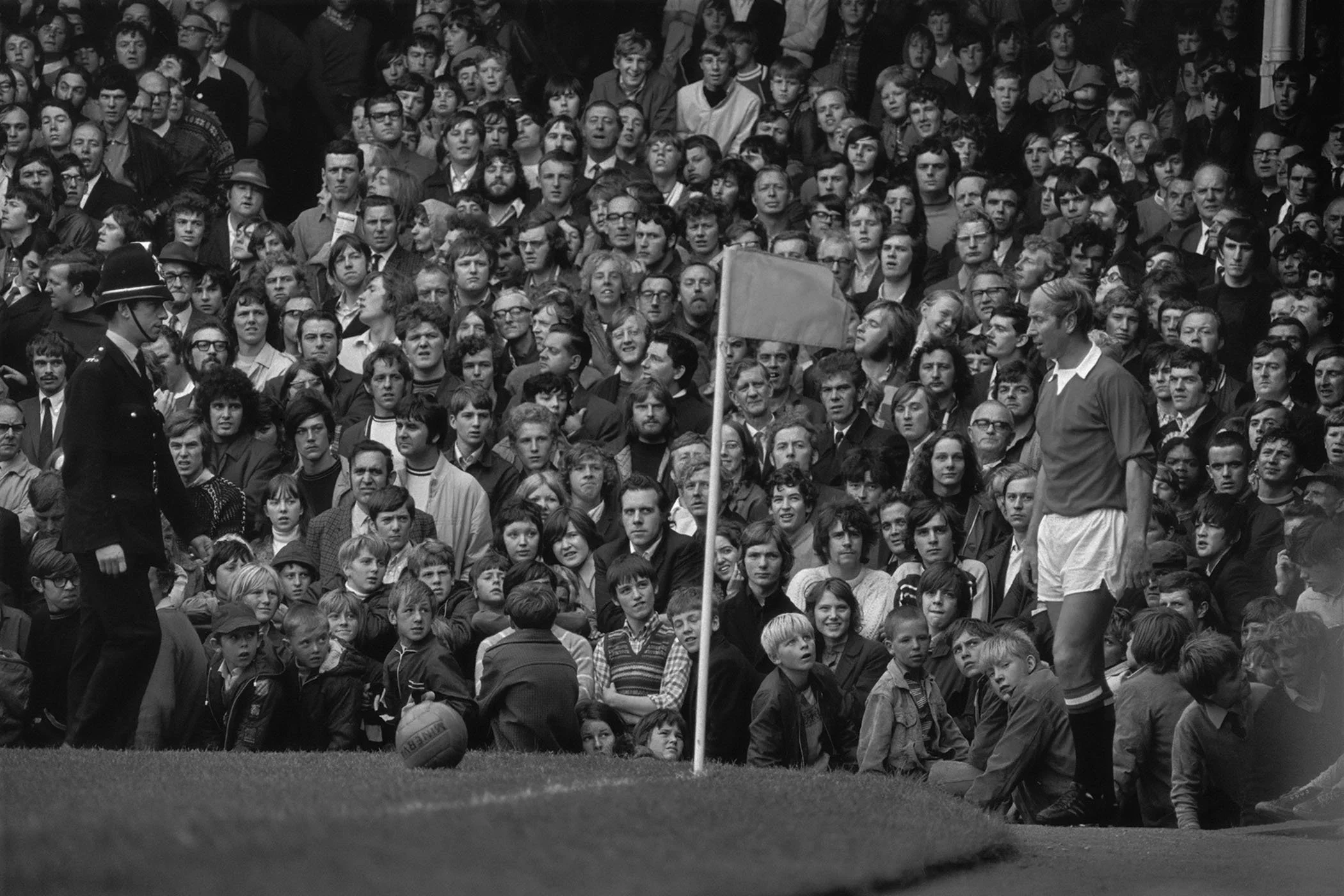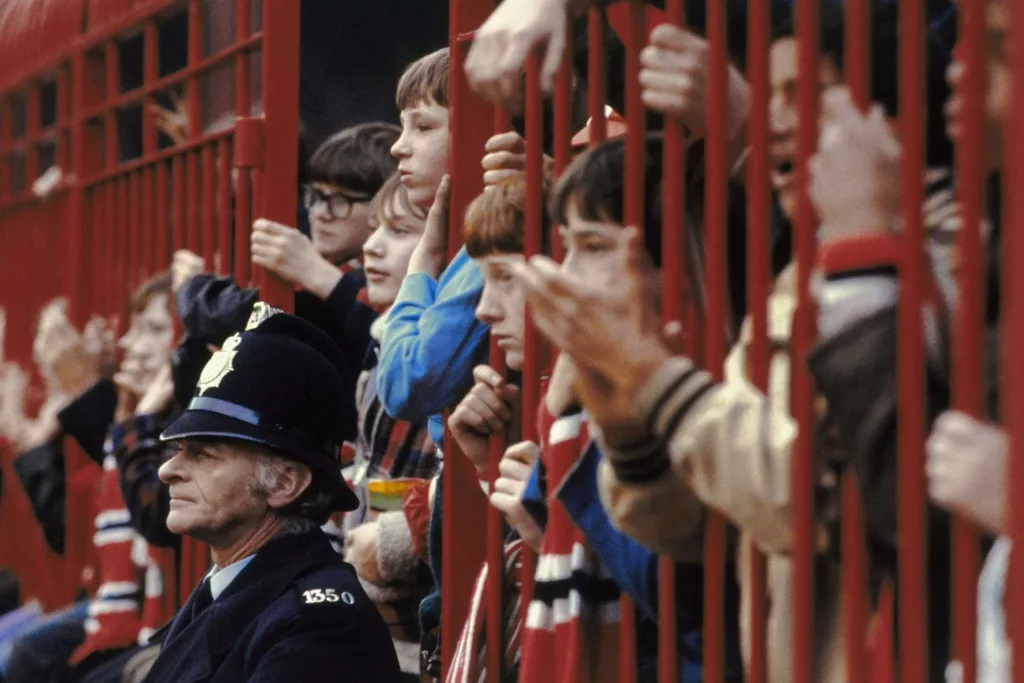 Le sue immagini spesso relegano il campo sullo sfondo. In primo piano ci sono le mani che stringono tazze di tè bollente, i volti segnati che guardano oltre la recinzione, i dettagli degli spalti consumati. Quando riprende l’azione, lo fa con distacco quasi etnografico: giocatori che sembrano figure in un paesaggio, non eroi in un’arena.